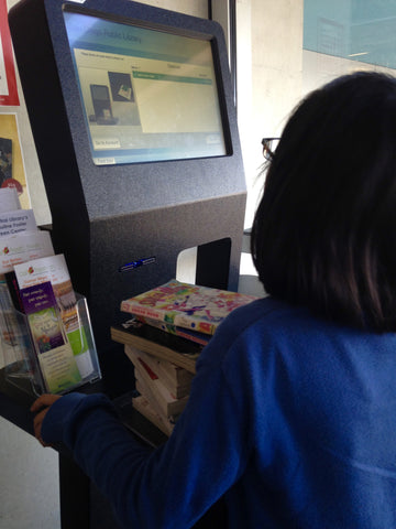 Checkout is a breeze with fully automated kiosks. Note that stack of manga our junior bibliophile got.